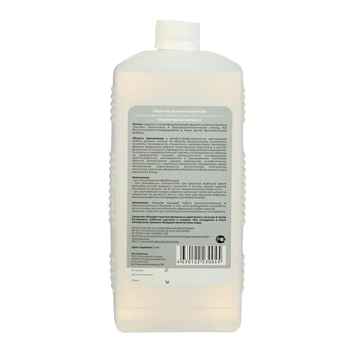 Состав: полигексаметиленгуанидин гидрохлорид 0,25% и дидецилдиметиламмоний хлорид - 0,55%, N,N бис(3-аминопропил)-додециламин 0,1%, а также вспомогательные компоненты.
