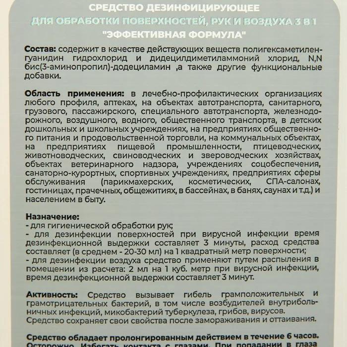 Средство дезинфицирующее 3в1 "Эффективная формула" вызывает гибель грамположительных и грамотрицательных бактерий, в том числе возбудителей внутрибольничных инфекций, микобактерий туберкулеза Mycobacterium terrae, грибов (включая дрожжеподобные грибы рода Кандида (кандидозы), вирусов (возбудителей энтеровирусных инфекций – полиомиелита, Коксаки, ECHO;энтеральных и парентеральных гепатитов, ВИЧ-инфекции, гриппа, парагриппа, вирусов свиного и птичьего гриппа и других типов вирусов гриппа, атипичной пневмонии,возбудителей острых респираторных вирусных инфекций, ротавируса, герпеса, цитомегаловируса, аденовируса, короновирусов и др.).