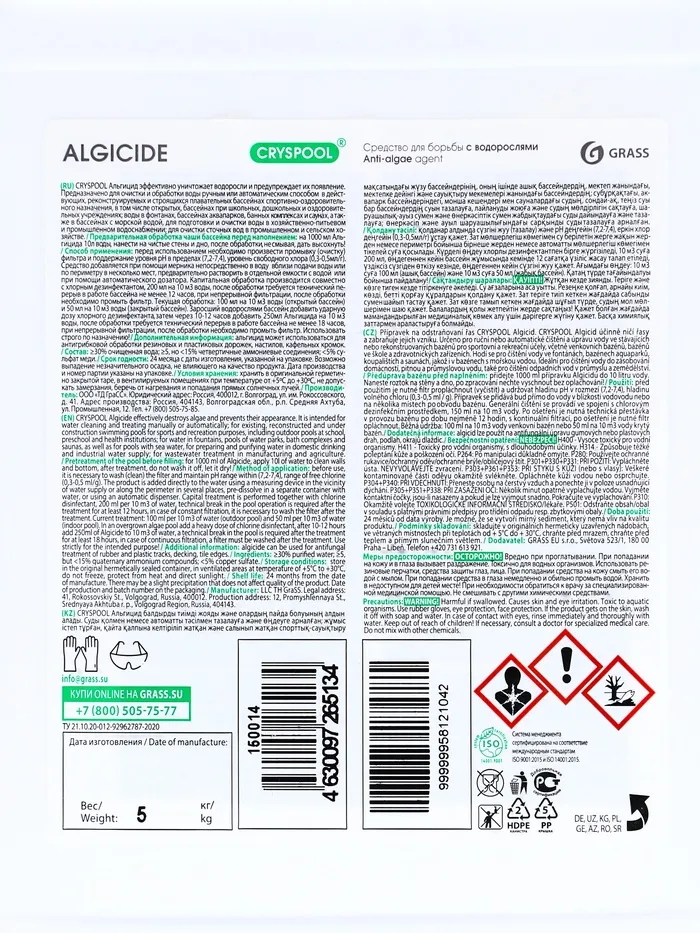 CRYSPOOL ALGICIDE — концентрированное средство для эффективной борьбы с водорослями в бассейнах. Формула направленного действия уничтожает зелёные, бурые и чёрные водоросли, препятствует их повторному росту и сохраняет воду прозрачной и безопасной.