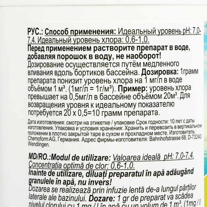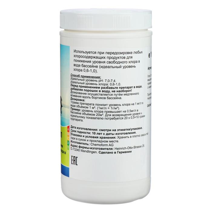 Применяется при передозировке любых хлорсодержащих продуктов для быстрого и надежного снижения уровня хлора в бассейне к идеальному (0,6–1,0).