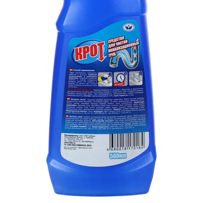 Средство для чистки канализационных труб "Крот", 500 мл — Характеристики
