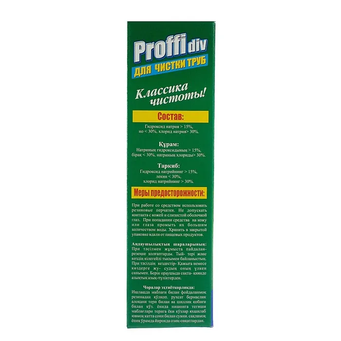 Меры предосторожности: при работе со средством использовать резиновые перчатки. Не допускать контакта с кожей и слизистой оболочкой глаз. При попадании средства на кожу или глаза промыть их большим количеством воды. Хранить в закрытой упаковке вдали от пищевых продуктов.