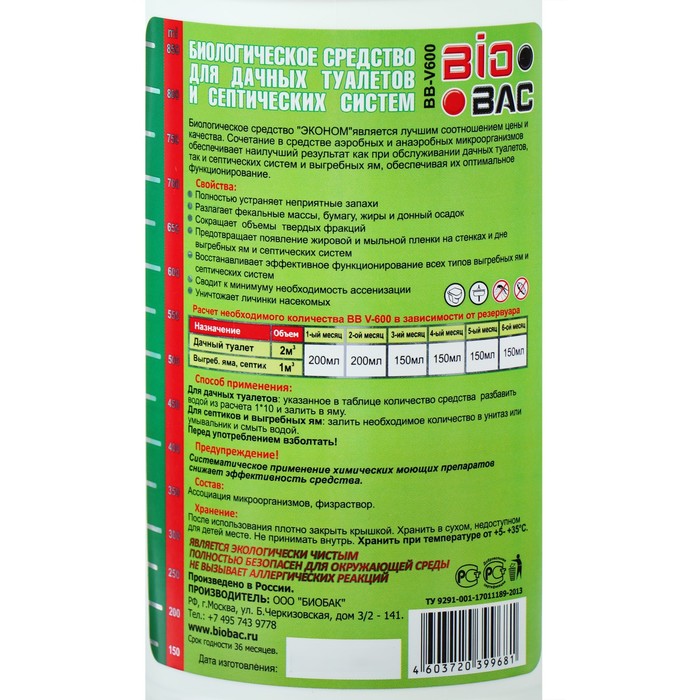 Средство для дачных туалетов и септиков BB-V600, биологическое180 дней, 1 л — Характеристики