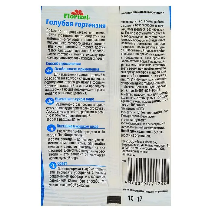 Удобрение FLORIZEL «Голубая гортензия» (50 г) поможет не только изменить цвет гортензии, но и стать растению более устойчивым к болезням. В основе удобрения — неорганические вещества, которые позволяют получать сбалансированное питание даже в неблагоприятных условиях.