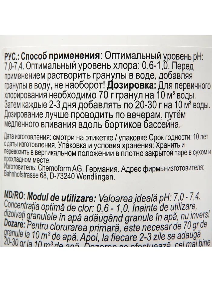 Средство ТМ Chemoform — хлорный препарат в гранулах для дезинфекции питьевой воды и воды в бассейнах.