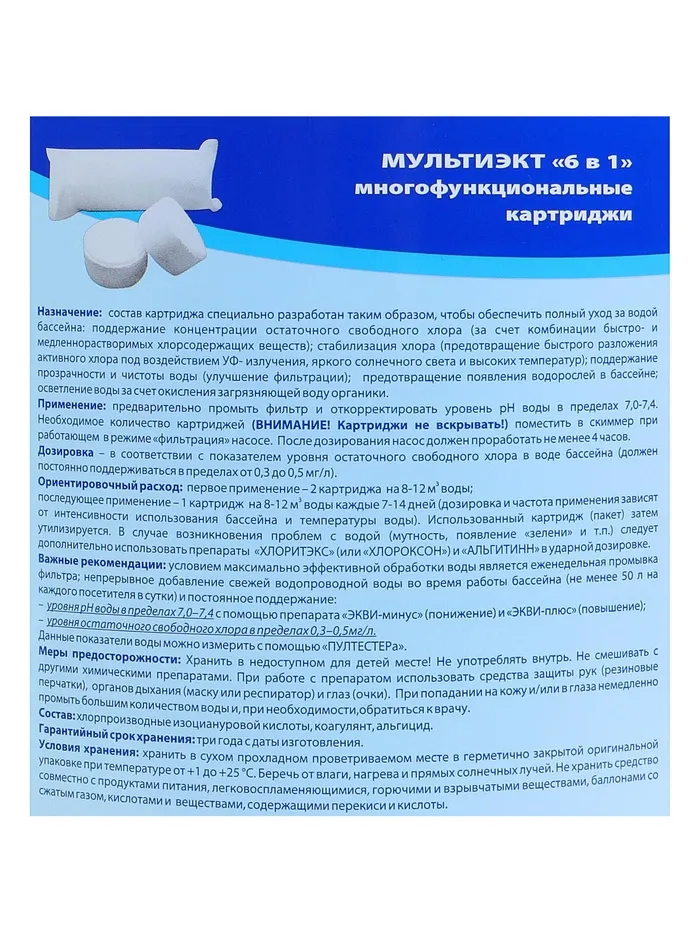 Применение: предварительно промыть фильтр и откорректировать уровень рН воды в пределах 7,0-7,4. Необходимое количество картриджей (ВНИМАНИЕ! Картриджи не вскрывать!) поместить в скиммер при работающем врежиме «фильтрация» насосе. После дозирования насос должен проработать не менее 4 часов. Дозировка - в соответствии с показателем уровня остаточного свободного хлора в воде бассейна (должен постоянно поддерживаться в пределахот 0,3 до 0,5 мг/л).