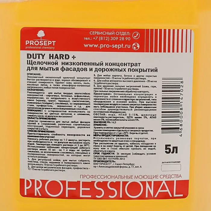 Средство для мытья фасадов и дорожных покрытий. Удаляет сажу, копоть, гарь, пыль, масляные пятна, а также атмосферно-почвенные загрязнения с фасадов зданий и других твердых влагостойких поверхностей: кирпичных, бетонных, асфальтовых, керамических, из натурального и искусственного камня (мрамор, гранит, терраццо), синтетических, полимерных (сайдинг, пластик), стеклянных, из нержавеющей стали, профнастила, окрашенных и т.д.