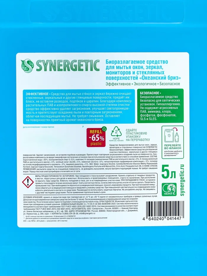 Средство для мытья окон и зеркал Synergetic «Океанский бриз», 5 л — Характеристики