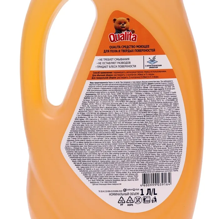 Средство для мытья пола и твердых поверхностей QUALITA WINTER CITRUS - это высокоэффективный продукт, который обеспечивает идеальную чистоту и блеск вашего пола. Он обладает приятным цитрусовым ароматом, который наполняет помещение свежестью. Средство легко справляется с различными видами загрязнений, включая жирные пятна и следы от обуви. Благодаря специальной формуле, оно не оставляет разводов и придает поверхности антистатический эффект, предотвращая оседание пыли. Объем флакона составляет 1000 мл, что обеспечивает множество использований.