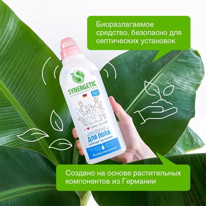 Биоразлагаемое концентрированное средство SYNERGETIC "Нежная чистота" - универсальное средство для ежедневной и генеральной уборки пола и других поверхностей: столов, стен, потолка.