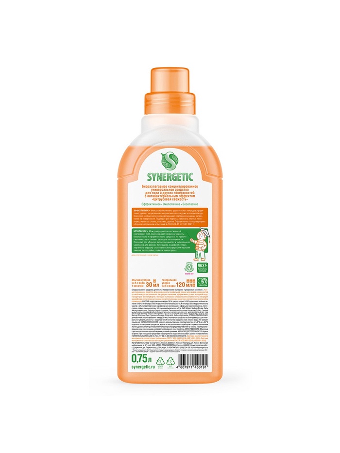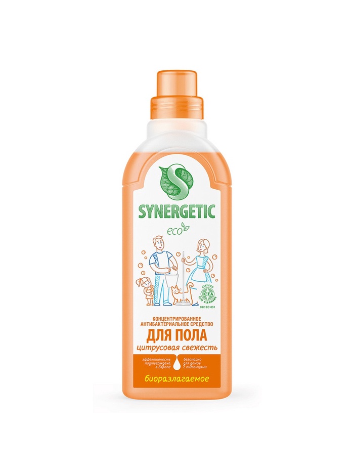 Биоразлагаемое концентрированное средство с антибактериальным эффектом SYNERGETIC "Цитрусовая свежесть" - универсальное средство для ежедневной и генеральной уборки пола и других поверхностей: столов, стен, потолка.