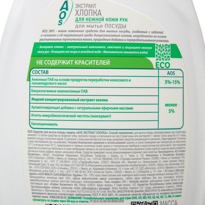 ECO Гель для мытья посуды AOS — это новый инновационный продукт, созданный на основе специально подготовленной структурированной воды. Она помогает растительным моющим веществам легче проникать вглубь пятна и удалять его с посуды. В составе новинки натуральные растительные ПАВ, получены из тропических масел, мощные в борьбе с жиром и безопасные для окружающей среды. Средство максимально смывается водой, не оставляет следов и разводов, обладает легким нейтральным ароматом. Идеален для сохранения баланса чистоты в доме и чистоты природы. AOS ЭКО не только без следа очищает посуду, но и сам просто и максимально смывается водой. Удобный формат с дозатором позволяет рационально расходовать средство. Упаковка полностью подлежит вторичной переработке.