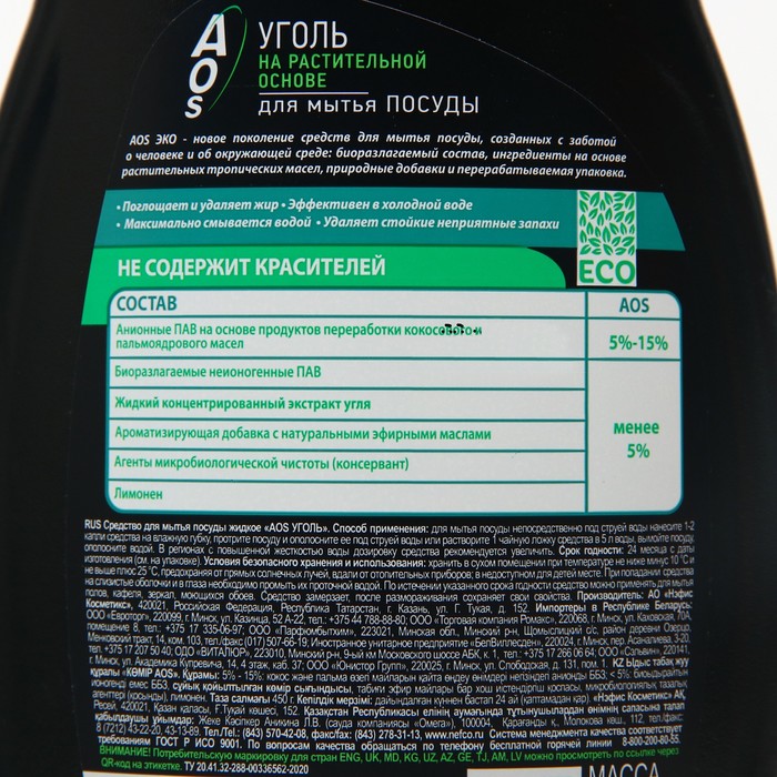 Средство для мытья посуды AOS уголь, ЭКО 450 г — Характеристики