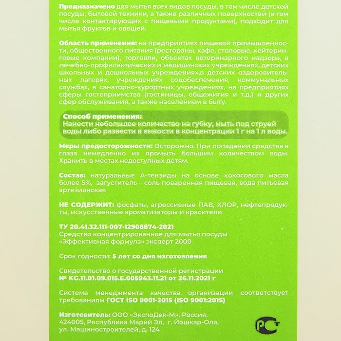 Средство для мытья посуды Эффективная формула "Эксперт 2000", концетрат - предназначено для мытья всех видов посуды, в том числе детской посуды, бытовой техники, а также различных поверхностей (в том числе контактирующих с пищевыми продуктами), подходит для мытья фруктов и овощей.