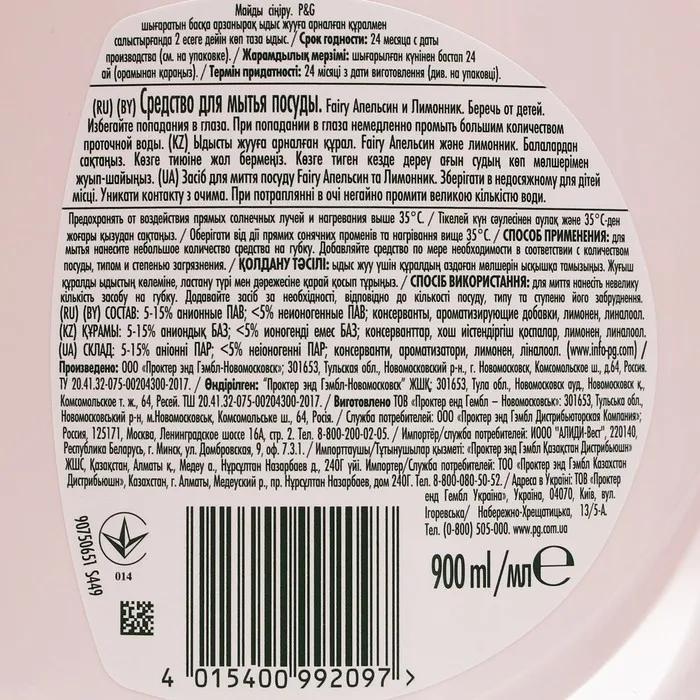 Состав: 5%–15% анионные ПАВ; <5% неионогенные ПАВ; консерванты, ароматизирующие компоненты.