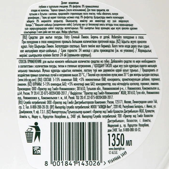 Fairy - безопасный продукт, разработанный в европейском научно-исследовательском центре (Brussels Innovation Centre) и полностью соответствующий ГОСТу РФ.