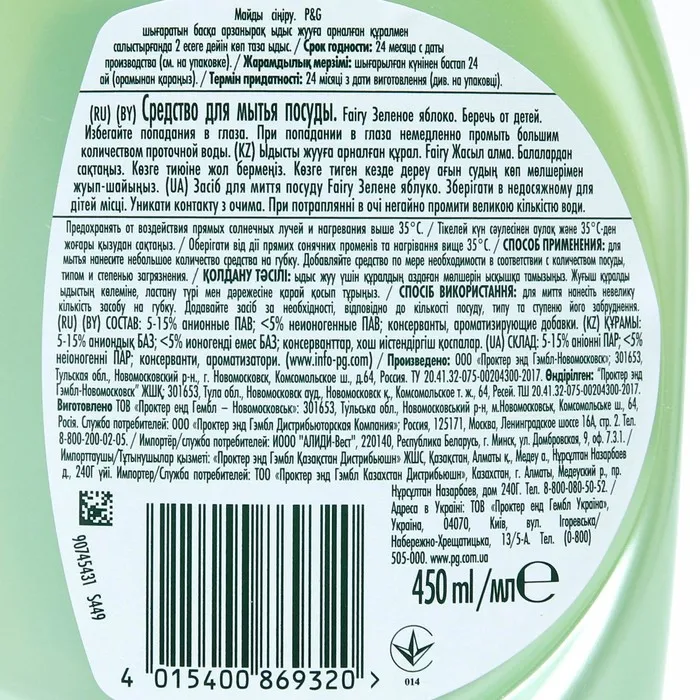 Fairy - безопасный продукт, разработанный в европейском научно-исследовательском центре (Brussels Innovation Centre) и полностью соответствующий ГОСТу РФ.