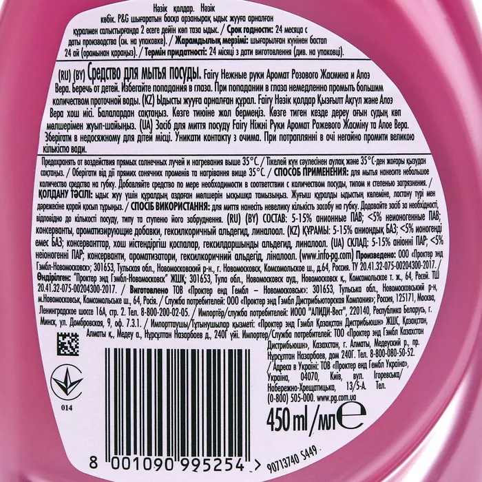 Средство для мытья посуды Fairy "Жасмин и алоэ вера", 450 мл — Характеристики