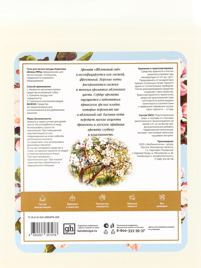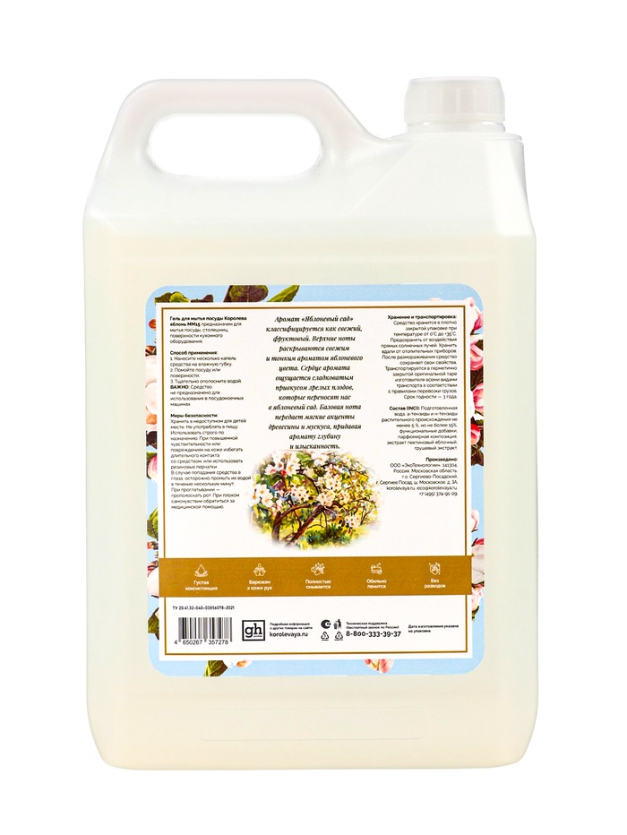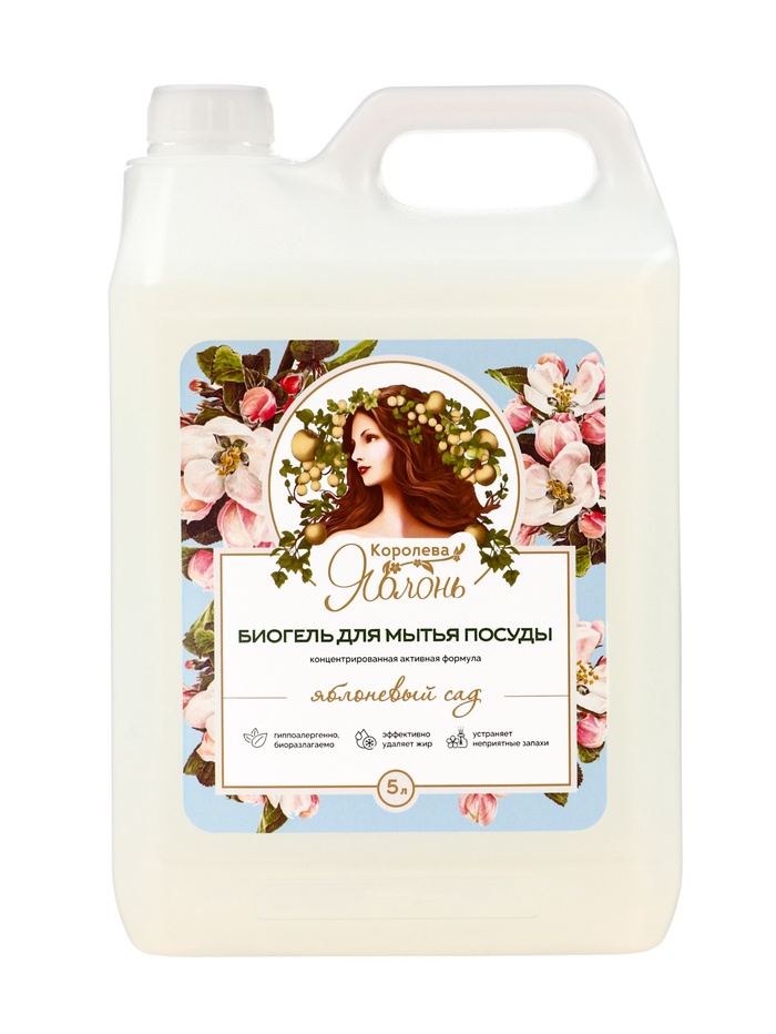 Средство для мытья посуды «Королева яблонь», гель-концентрат, 5 л – гипоаллергенный концентрированный гель для эффективного и безопасного мытья посуды. Легко удаляет жир, остатки пищи и налёт, при этом заботясь о коже рук. Аромат яблоневого сада наполняет кухню свежестью и приятной фруктовой ноткой, превращая ежедневную уборку в маленькое удовольствие.