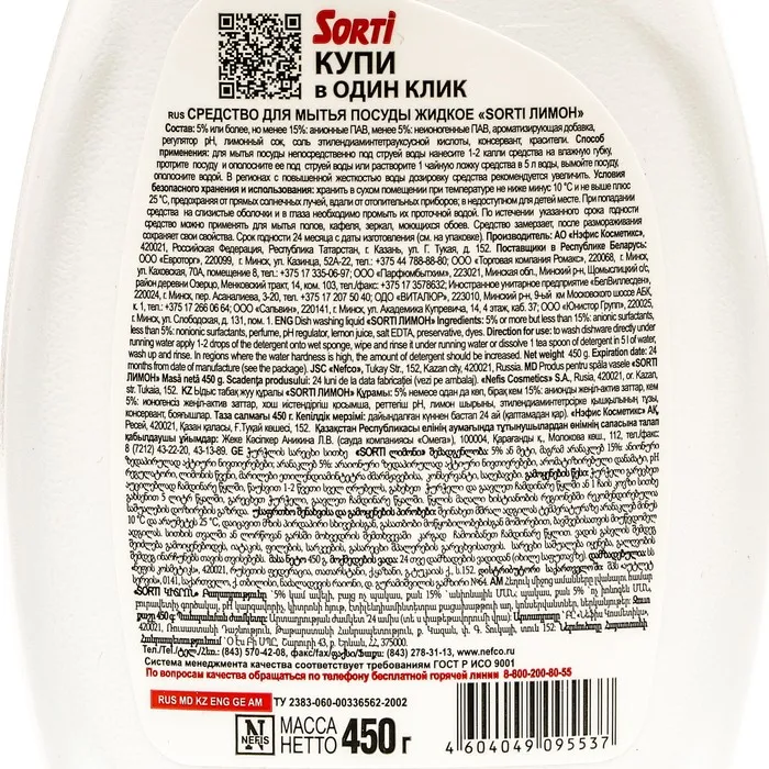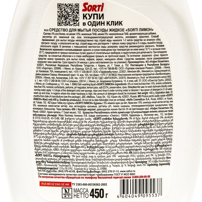 Средство для мытья посуды Sorti "Спелый лимон", 450 мл