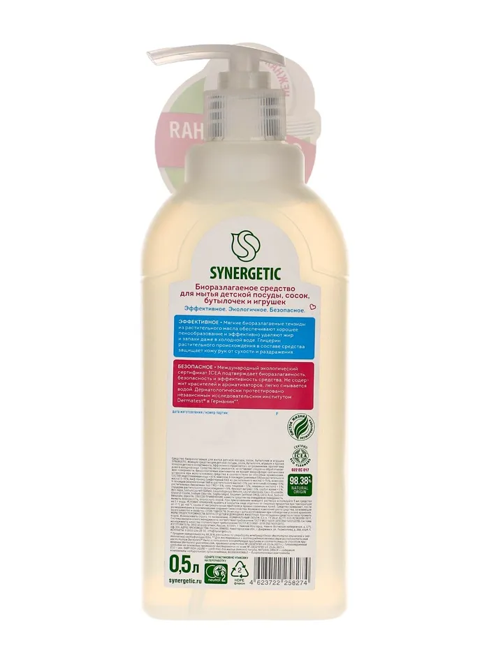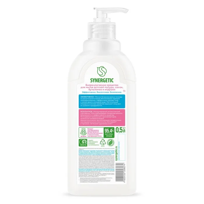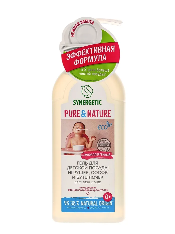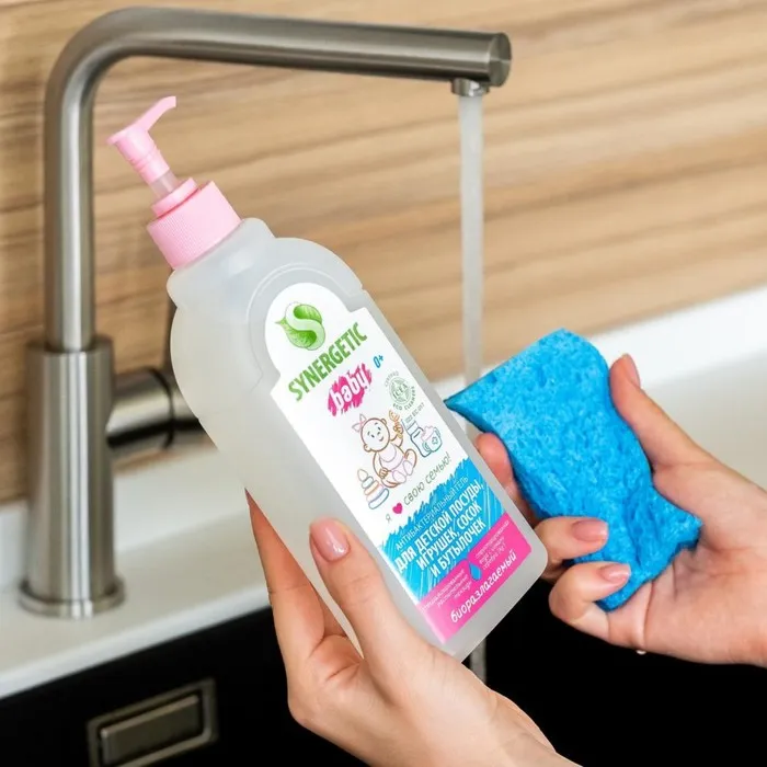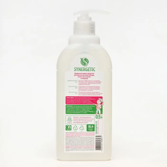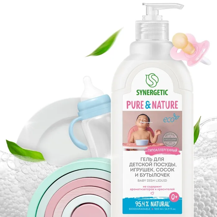 Биоразлагаемый концентрированный гель для мытья детской посуды SYNERGETIC - это экологичное, безопасное и эффективное средство для мытья детской посуды, сосок, бутылочек, игрушек и прочих товаров детского ассортимента от любых видов загрязнений.