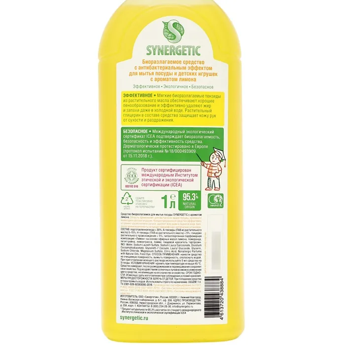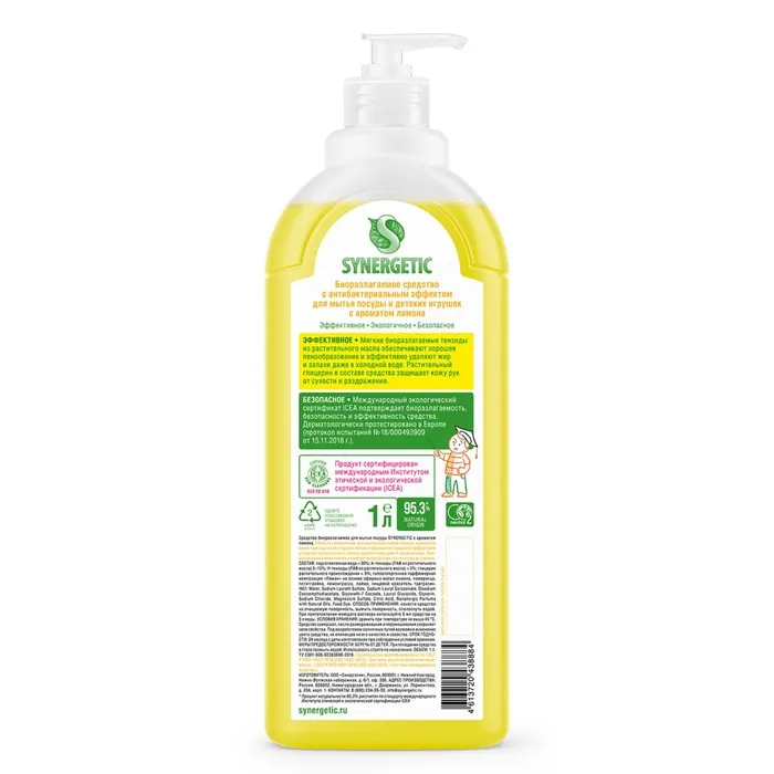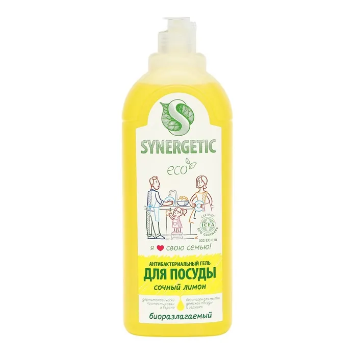 Биоразлагаемый концентрированный гель для посуды с антибактериальным эффектом SYNERGETIC - это экологичное, безопасное и эффективное средство для мытья всех видов посуды, в том числе детской, кухонного инвентаря и детских игрушек от любых видов загрязнений.