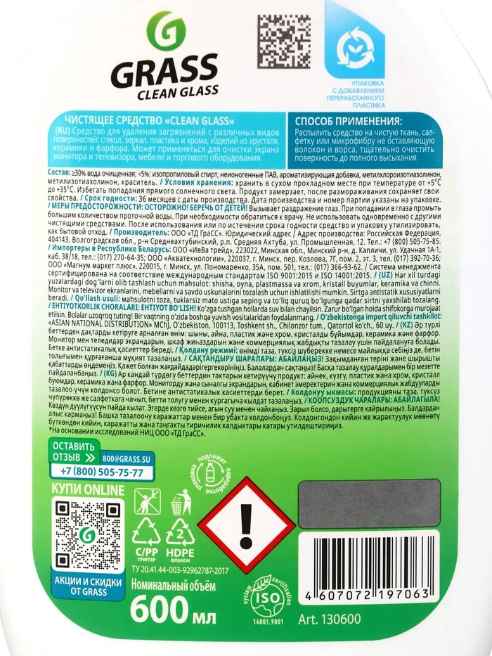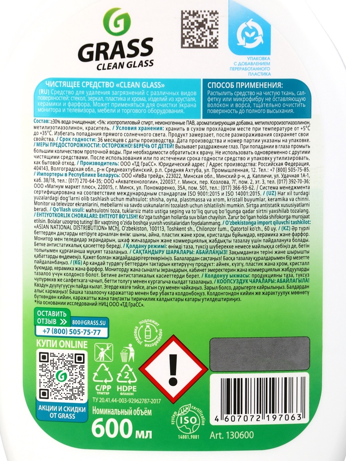 Универсальный очиститель от торговой марки Grass применяется для стёкол, зеркал, пластика, хрома и кафеля. Не оставляет подтёков и разводов, обладает антистатическим эффектом. Удаляет пятна и следы от пальцев, защищает от пыли, придаёт блеск.