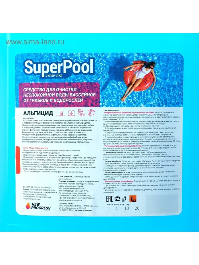 В соответствии с требованиями санитарно-эпидемиологической безопасности и поддержания воды в бассейнах в пределах санитарных норм, средство «Супер-пул Альгицид» предназначено для уничтожения водорослей и грибков и предупреждения их образования в плавательных бассейнах с проточной водой: с фонтанами, противотоками, горками, в SPA-бассейнах, аквапарках. Используется для антигрибковой обработки санитарно-технического оборудования, душевых кабин, кафеля, пластика, ковриков, настилов. Средство следует применять в составе комплексной обработки воды бассейнов и фонтанов, антигрибковой обработки ванных комнат, санузлов. Рекомендуется использовать в сочетании с окисляющими препаратами.