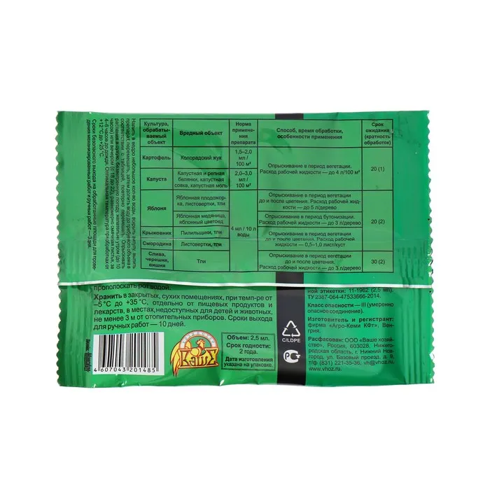 Относится к группе пиретроидов, обладает низкой токсичностью для теплокровных, эффективен против большинства вредителей на основных садовых (яблоня, слива, вишня, черешня, крыжовник, смородина), а также огородных (капуста) культурах (кроме популяций вредителей, обладающих резистентностью к пиретроидам).
