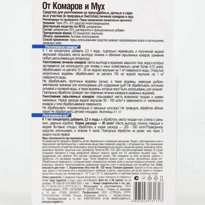 Способ применения: опрыскивание водоема (пруды, емкости), опрыскивание открытых непроточных водоемов (прудов, луж, заболоченностей, канав). Опрыскивание твердых и жидких бытовых отходов.