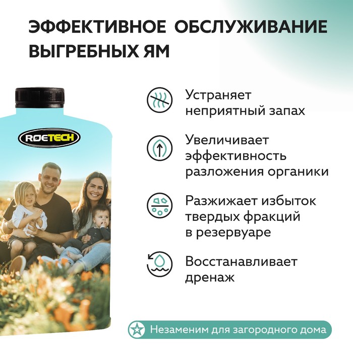 Средство для обслуживания выгребных ям дачных туалетов. Выгребные ямы требуют регулярной обработки из-за накопления органики, фекалий, бумаги, моющих веществ и различной химии. Это приводит к переполнению резервуаров, появлению неприятного запаха, ухудшению дренажа с последующим заиливанием системы. Использование Roetech К-47 позволяет устранять вышеуказанные проблемы путем быстрого разложения органических отходов и других загрязнений. Значительно уменьшает объем твердых фракций. Экологичен, безопасен.