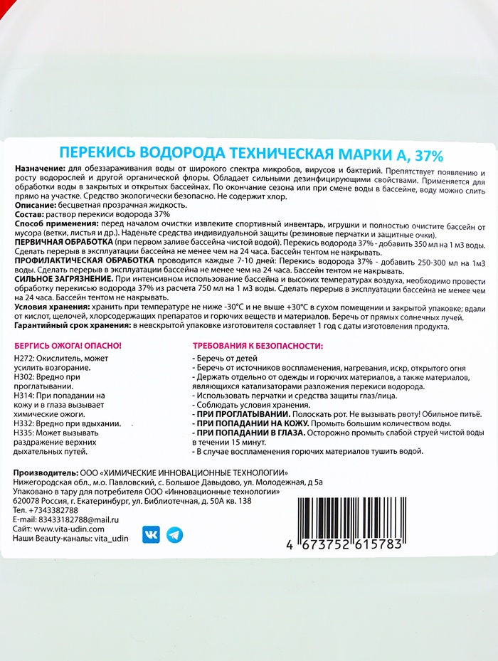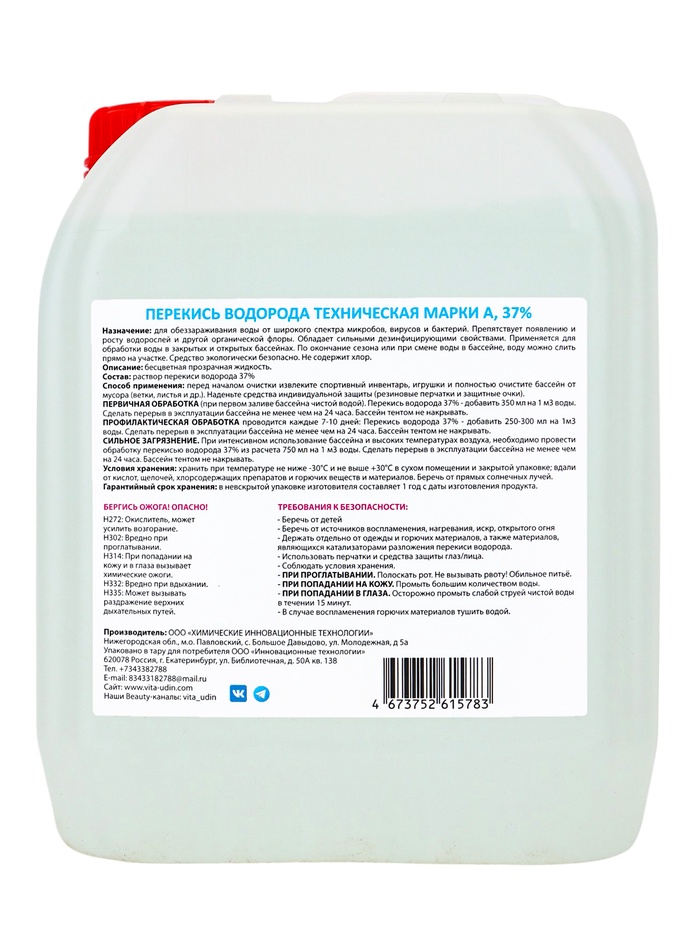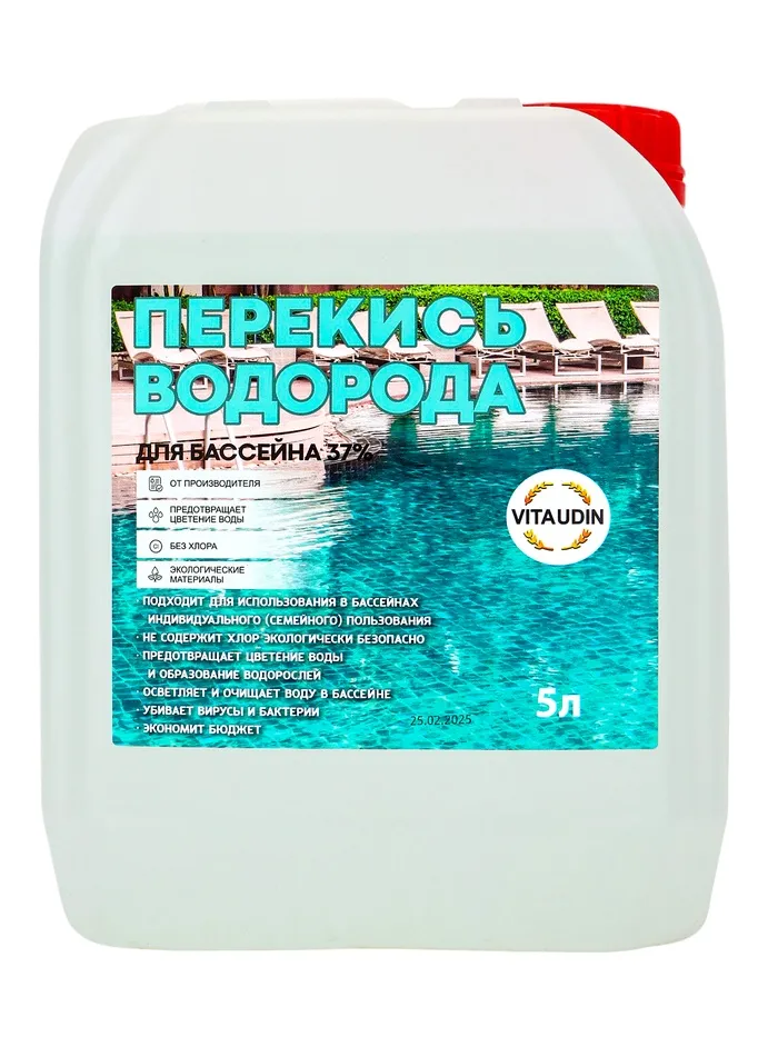 Перекись водорода 37% (5 л.) — мощное и экологичное средство для дезинфекции и очистки бассейнов, СПА и искусственных водоёмов. Оно эффективно уничтожает бактерии, вирусы, грибки и водоросли, не оставляя запаха и не вызывая раздражения кожи при правильном применении. В отличие от хлорсодержащих средств, перекись водорода не образует вредных побочных продуктов и не меняет вкус или цвет воды.