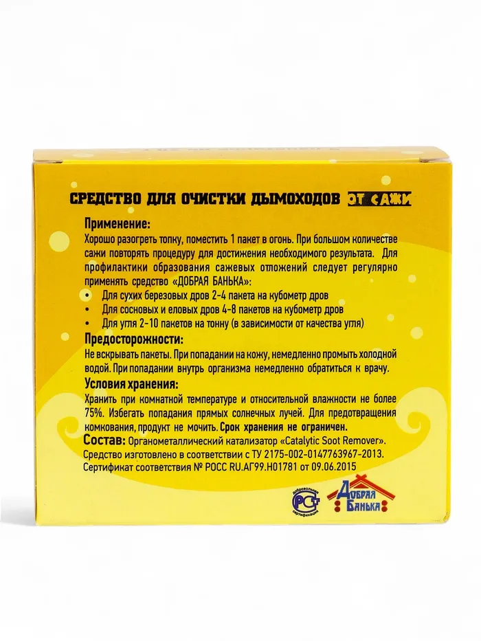 Очиститель «Добрая банька» — это комплексное средство для профилактического ухода за дымовыми каналами печей, каминов и банных котлов. Оно помогает контролировать образование сажи, поддерживая хорошую тягу и снижая риск возгорания.