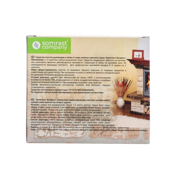 Средство для очистки дымоходов «Трубочист Экспресс» — простой и нетоксичный способ немеханической очистки от сажи, креозота и копоти для дымоходов и внутренних поверхностей топок, печей, теплообменников, каминов, работающих на твёрдом топливе. Не вызывает коррозии. Заменяет механическую очистку.