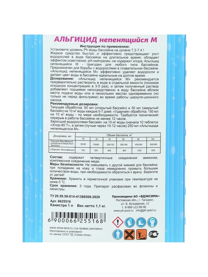 Способ применения: установите уровень pH воды бассейна в диапазоне 7,2–7,4. Непенящийся альгицид рекомендуется предварительно растворить в воде, в отдельной ёмкости (понижая исходную концентрацию в 3–5 раз). Полученный раствор добавляют порциями непосредственно в воду бассейна вблизи места подачи воды или в нескольких местах одновременно (но только не перед фильтрами) во время работы циркуляционного насоса.