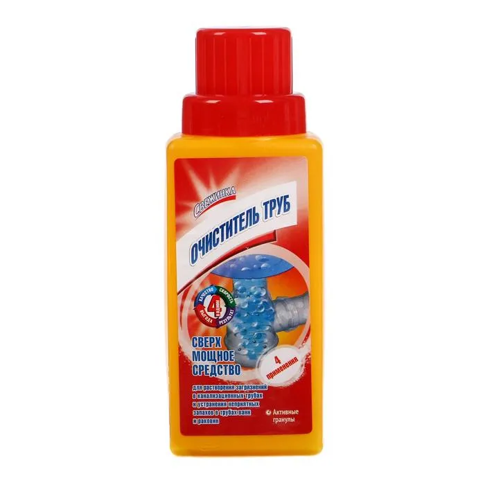 Предназначено для устранения и профилактики засоров в канализационных трубах. Эффективно устраняет даже сильные засоры. Растворяет органические загрязнения (жиры, волосы, остатки пищи).