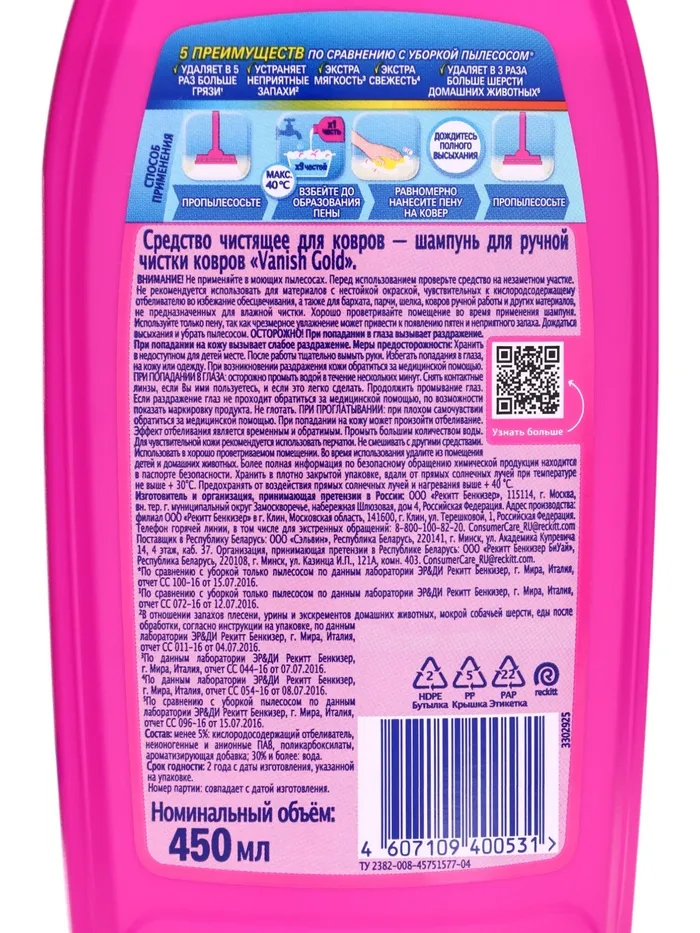 - Объем упаковки: Упаковка на 450 миллилитров обеспечивает достаточное количество средства для чистки нескольких ковров.