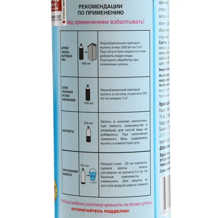 Для выгребных ям и дачных туалетов: вылейте содержимое бутылки (из расчёта 350 мл на 2 м³) в один из углов. Если там отсутствует жидкость, то добавьте 5–10 литров тёплой (не выше 35 °С) нехлорированной воды. Через 7–10 дней неприятные запахи значительно уменьшатся, и биопрепарат до наступления морозов будет эффективно перерабатывать поступающую органику.