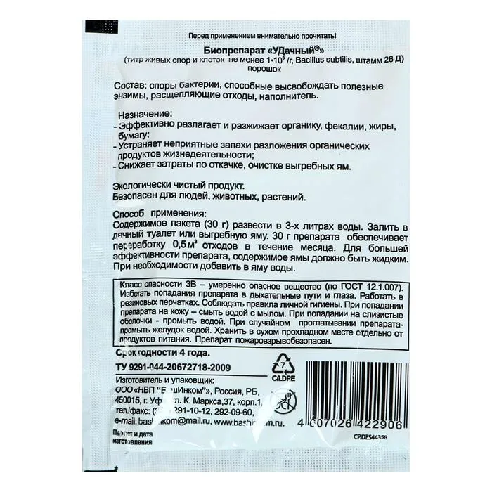 Микробиологический препарат пригодится для дачных туалетов, выгребных ям, биотуалетов. Действующими веществами являются споры и живые клетки бактерий. Средство эффективно разлагает органику, фекалии, жиры, бумагу, устраняет неприятные запахи разложения органических продуктов жизнедеятельности.