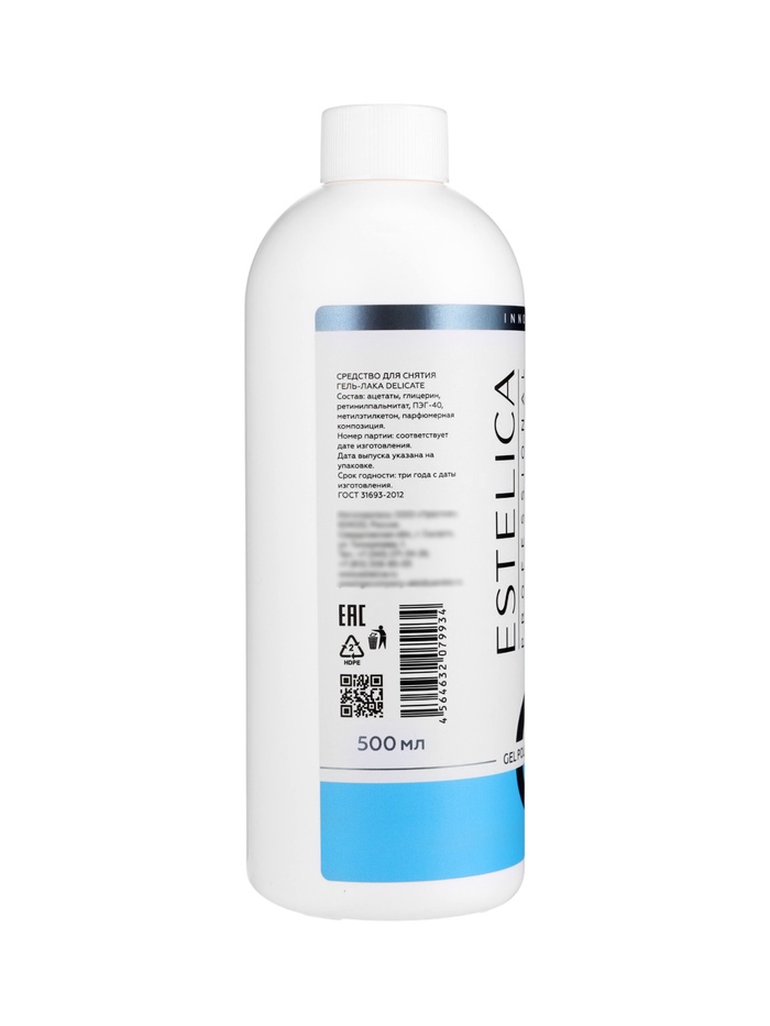 ESTELICA PROFESSIONAL DELICATE, средство для снятия гель-лака 500 мл — профессиональная деликатная формула, созданная для мягкого и эффективного удаления всех видов гель-лаков с натуральных ногтей. Средство бережно воздействует на ногтевую пластину и кожу вокруг ногтей, предотвращает пересушивание и сохраняет естественный блеск ногтей.
