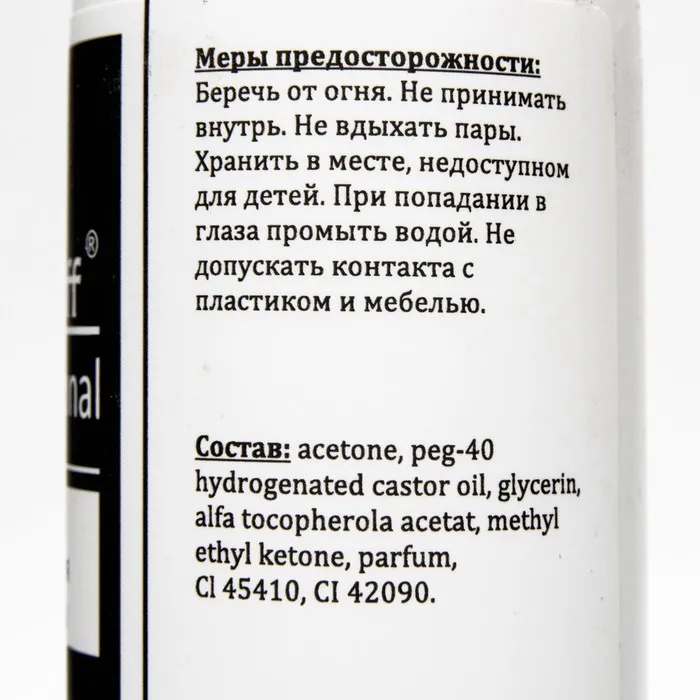 Gel-off Professional поможет вам снять гель-лак (или шеллак). Он подходит для любых систем декорирования и моделирования ногтей. Входящие в состав средства касторовое масло и витамин Е смягчают действие активных компонентов.