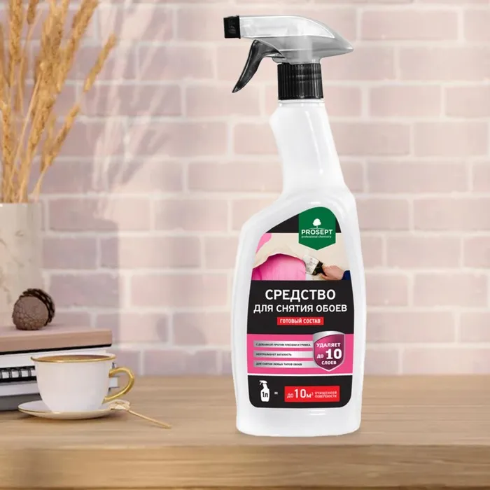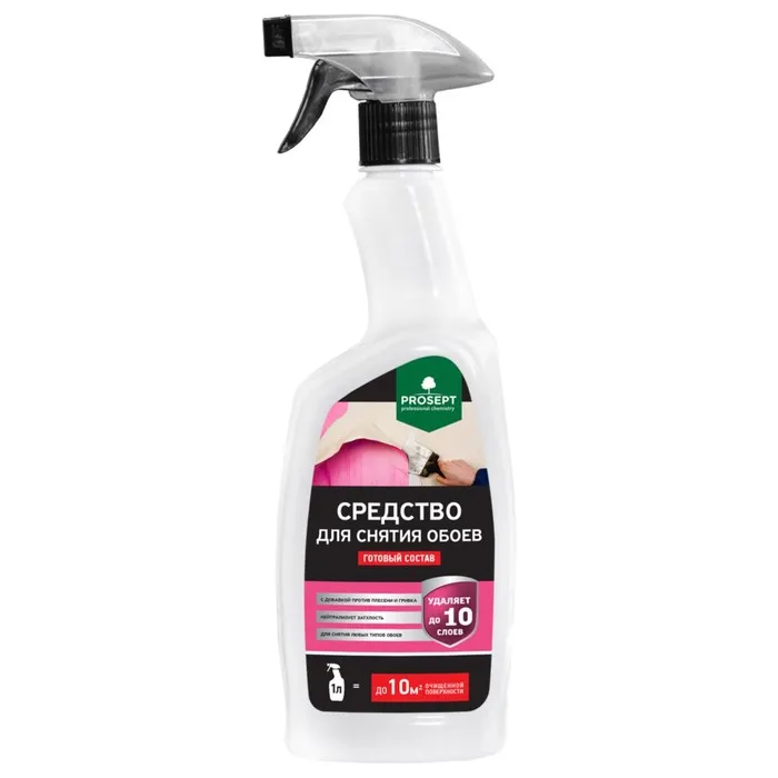 Средство для снятия обоев Prosept – эффективно проникает на глубину до 10 слоев, растворяет клей и подходит для всех типов обоев. Не содержит агрессивные растворители, после использования не требует смывания.
