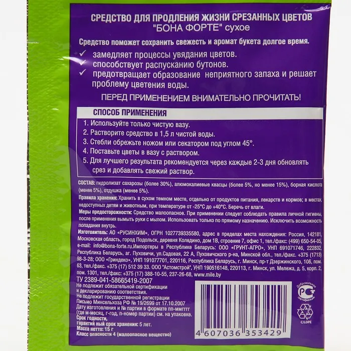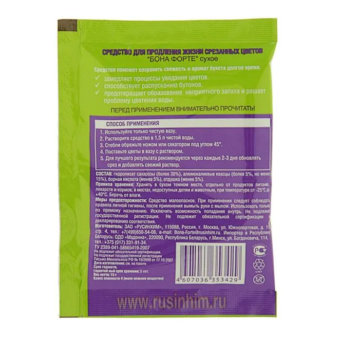 Средство для сохранения свежести срезанных цветов Бона Форте, пакетик, 15 г — Характеристики