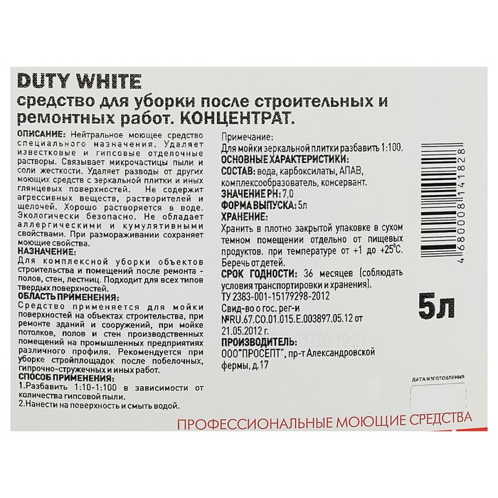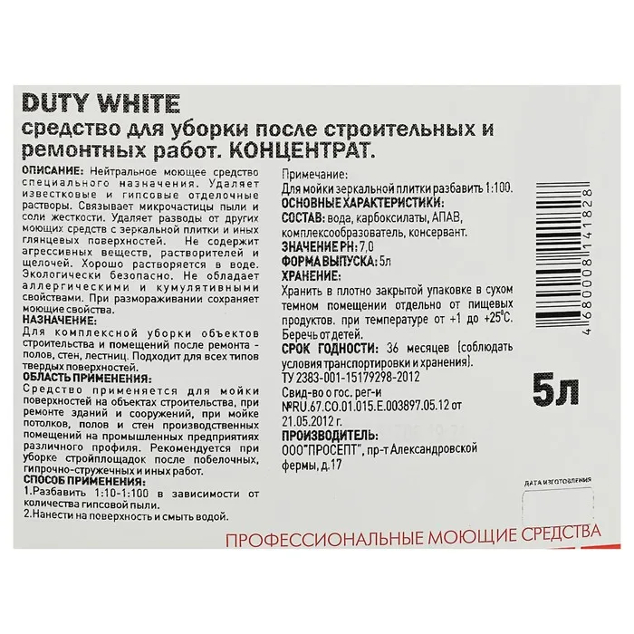 Моющее средство для уборки после строительных и ремонтных работ. Позволяет быстро и эффективно удалять налёты известковых и гипсовых отделочных растворов, отмывать твёрдые поверхности, возвращая им первозданный вид и чистоту. Не содержит агрессивных веществ, растворителей и щелочей.
