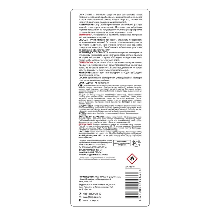 Состав: углеводородный растворитель, органические растворители, D-лимонен 5-15%, НПАВ менее 5%.