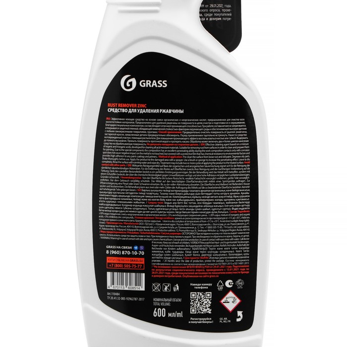 Антикоррозионное покрытие RUST REMOVER ZINC защищает от коррозии и препятствует распространению ржавчины. Эффективное моющее средство на основе смеси органических и неорганических кислот, предназначенное для очистки всех кислотостойких материалов, металлических (стальных) поверхностей с целью удаления (преобразования) коррозионных поражений (ржавчины) и защиты обработанных поверхностей от последующих атмосферно-климатических воздействий. Предназначено для удаления ржавчины на поверхности в целях очистки и подготовки их к окрашиванию. Благодаря специальным компонентам, состав глубоко проникает сквозь коррозию до металла, вытесняя влагу и кислород, останавливает и предотвращает развитие коррозии. При работе состава металл не затрагивается, а покрывается защитной пленкой, обладающей химической стойкостью к факторам окружающей среды и обеспечивающей высокую адгезию с любыми лакокрасочными покрытиями, грунтами.