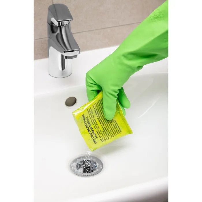 Способ применения: вскрыть упаковку и достать внутренний пакет. Избегая контакта с кожей, пакет вскрыть, предварительно встряхнуть. Содержимое пакета засыпать в сливное отверстие раковины, ванны, затем добавить 50 мл теплой воды. Через 30-50 мин промыть трубу большим количеством воды. При необходимости операцию повторить. Для профилактики средство рекомендуется применять не реже 1 раза в месяц.