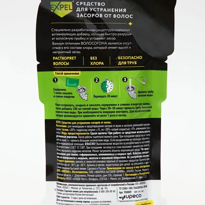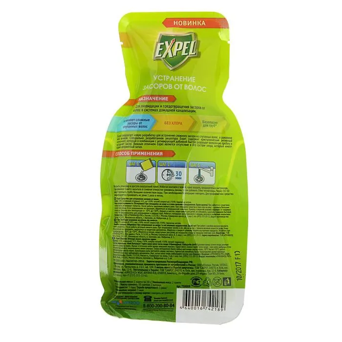 Средство для устранения засоров от волос. Для ликвидации и предотвращения засоров от волос в системах домашней канализации. Устраняет сложные засоры от спутанных волос. Не содержит хлора. Безопасно для труб.
