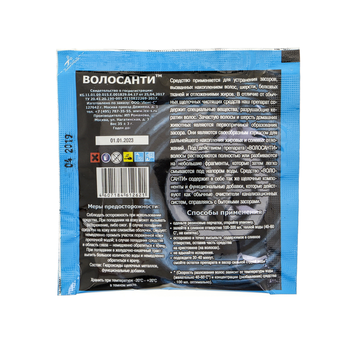 являются своеобразным каркасом для дальнейшего накопления жировых и солевых отложений. Под действием препарата «Волосанти» волосы растворяются полностью или разбиваются на небольшие фрагменты, которые затем легко смываются под напором воды. «Средство Волосанти» содержит в себе так же щелочные компоненты и функциональные добавки, которые действуют как обычные очистители канализационных систем, справляясь с бытовыми засорами.