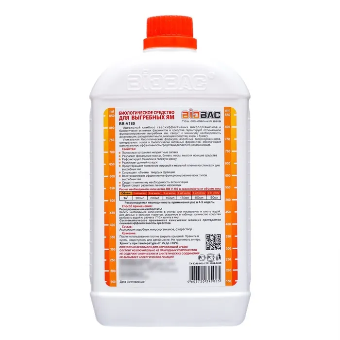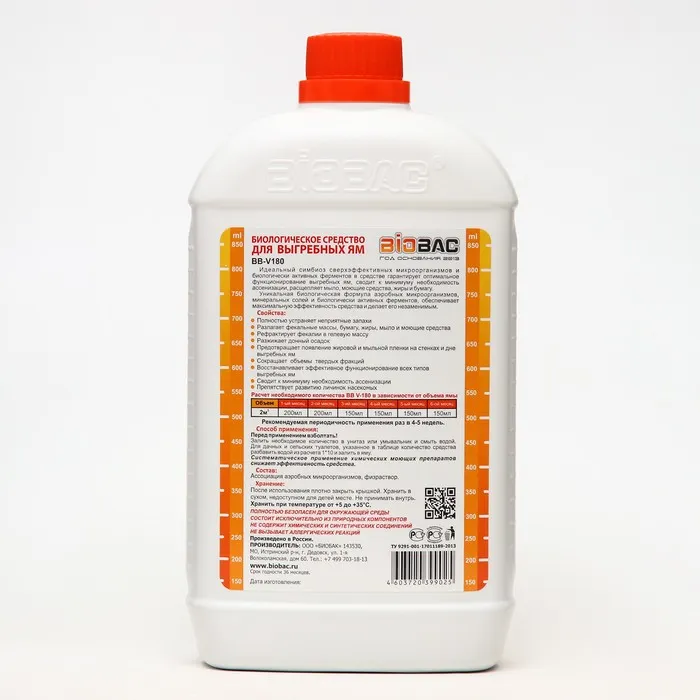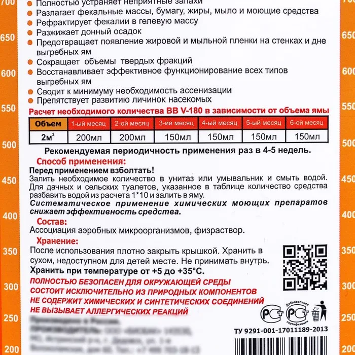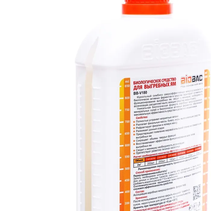 Описание: Идеальный симбиоз сверхэффективных микроорганизмов и биологически активных ферментов в средстве гарантирует оптимальное функционирование выгребных ям, сводит к минимуму необходимость ассенизации, расщепляет мыло, бумагу. Уникальная биологическая формула аэробных микроорганизмов, минеральных солей и биологически активных ферментов обеспечивает максимальную эффективность средства.